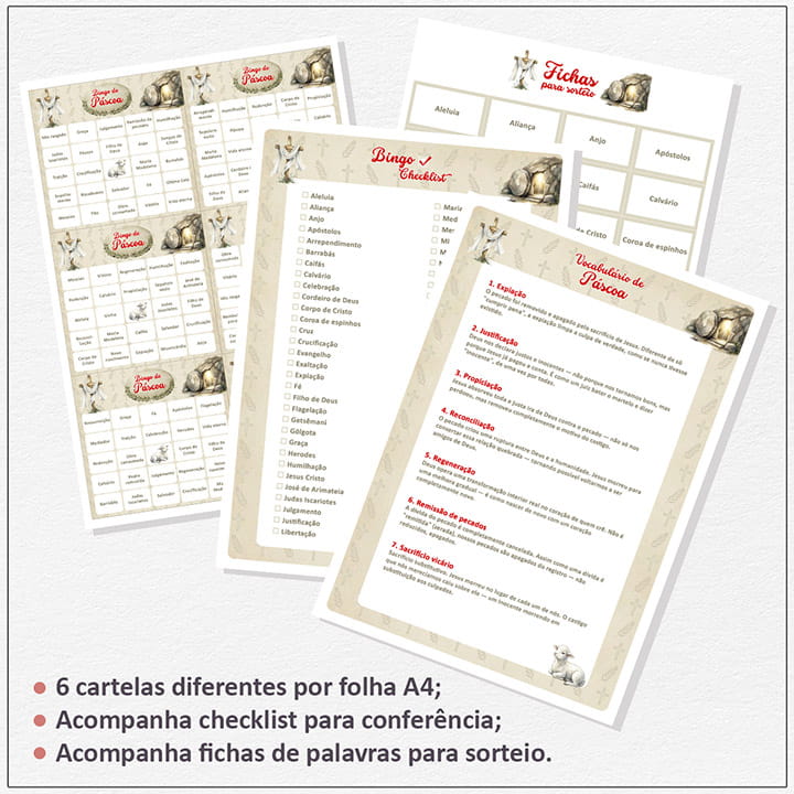 – As palavras do Bingo estão relacionadas à narrativa bíblica e ao significado da Páscoa cristã — personagens, eventos, lugares, símbolos e doutrinas teológicas.